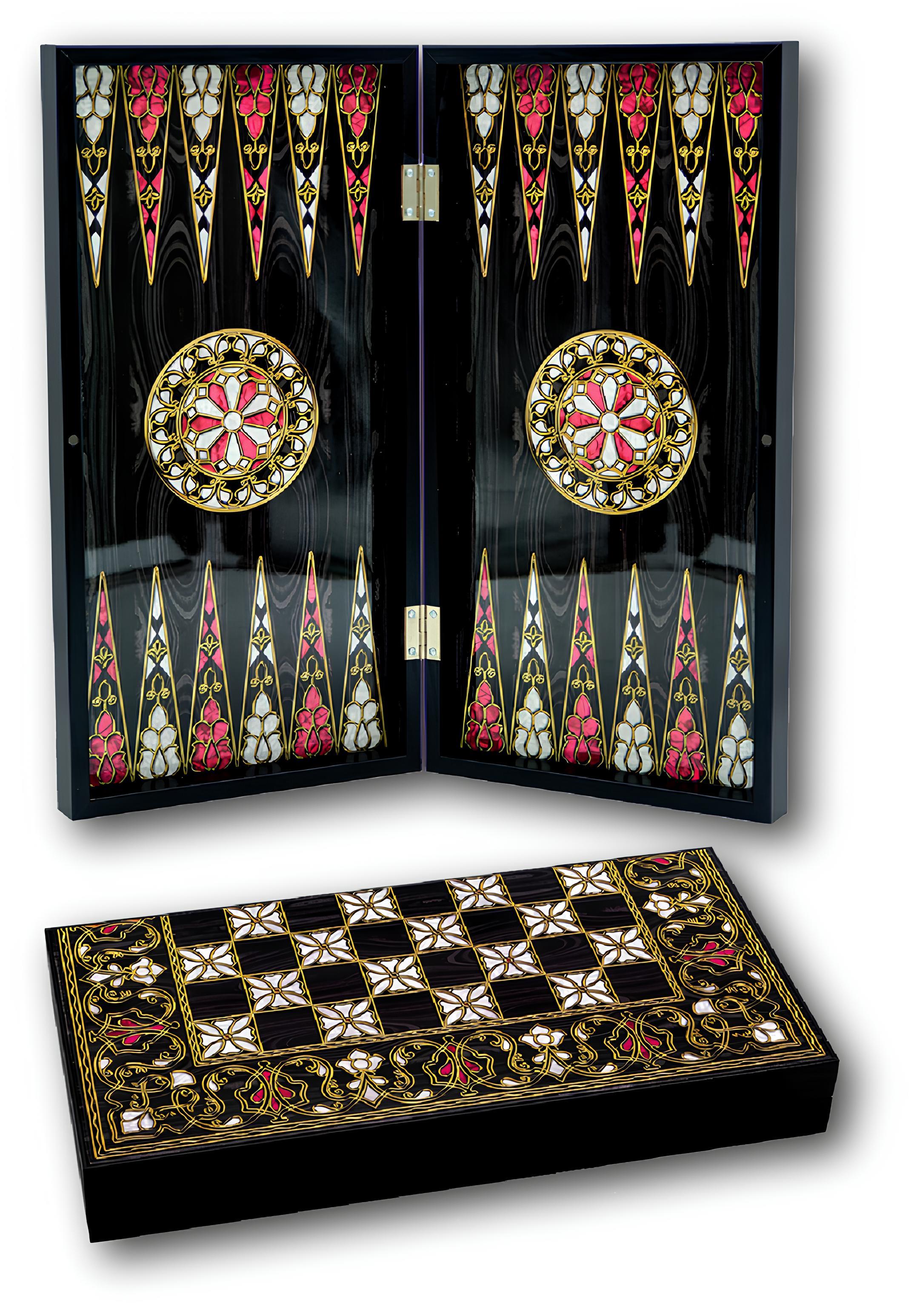Tavla Takımının iç ve dış kenarları desenlerine uygun boya ile boyanırken aynı katmanda vernikler ile koruma altına alınmıştır.